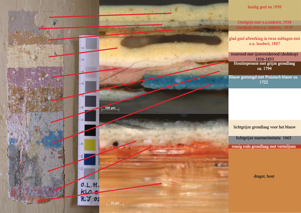 Kleuren vormen een belangrijk onderdeel van historische gebouwen. Gebruikte materialen als bak- of natuursteen én schilderwerk bepalen de kleurstelling van een pand. In de loop van de tijd verandert die kleurstelling, door modegevoeligheid en door verwering. Terwijl de vroeger toegepaste olieverven tientallen keren overgeschilderd konden worden zonder verstikkend te werken, vragen veel moderne verfsystemen het kaal halen van houtwerk. Daarmee verdwijnt waardevolle informatie over oorspronkelijke kleuren.