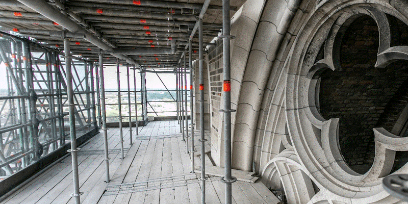 Binnen in de steiger wordt hard gewerkt aan de restauratie van de Domtoren - foto: ERM