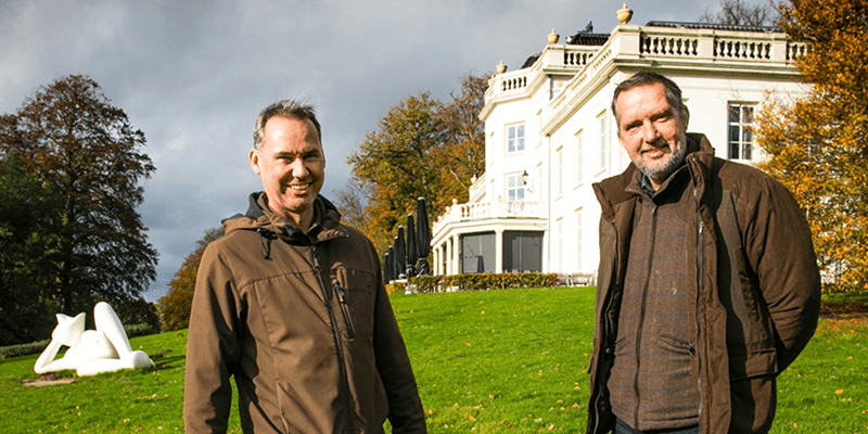 Jan Floor (l) en Rob Borst (r) voor de bekende witte villa van Sonsbeek - Foto: ERM