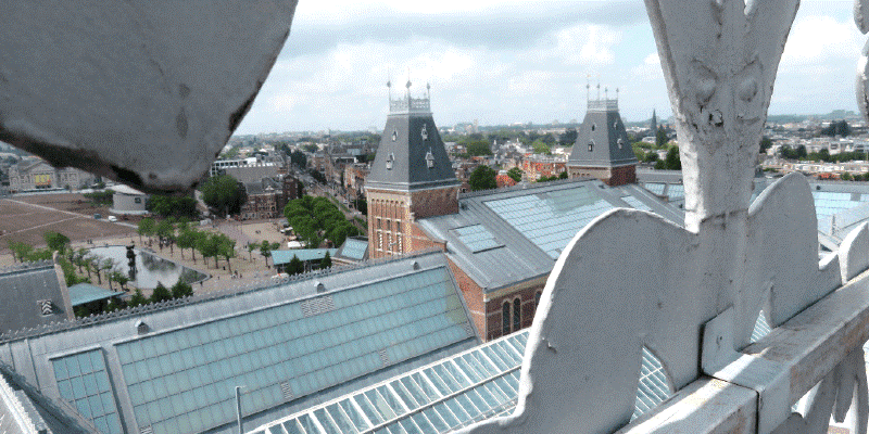 Ten slotte laat Peter van der Landen trots nog wat foto’s zien die hij heeft gemaakt bij de inspectie op het dak van het Rijksmuseum in Amsterdam. “Kijk hier”, zo wijst hij op een van de selfies, en lacht. “Ik sta hier naast een van de grote beelden op het dak, en zoals je ziet is het schilderwerk aan de onderkant van deze persoon aangetast. Maar ik kan je verzekeren dat dit een conditie is die ik op dit moment nog niet goed kan aangeven binnen de URL: ‘verfschade aan de onderkant van beeld op dak’.”