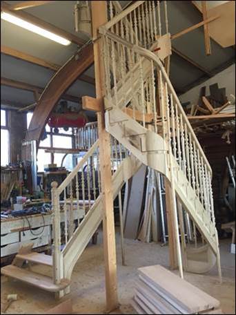 Op deze foto het opstellen van trapdelen in de werkplaats (t.b.v. controle op passing en juiste maatvoering met aansluitingen).