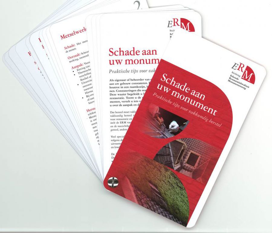 Om eigenaren en beheerders van monumenten te ondersteunen bij het vakkundig laten herstellen van schade aan hun gebouw, heeft de stichting Erkende Restauratiekwaliteit Monumentenzorg de publicatie ‘Praktische tips voor vakkundig herstel’ uitgebracht. De publicatie, in de vorm van een waaier, toont de meest voorkomende schades en beschrijft de mogelijke oorzaken. Vervolgens informeert de waaier over de aanpak, de wijze van herstel en het gebruik van kwaliteitsrichtlijnen daarbij. In veertien bladen wordt ingegaan op de meest voorkomende problemen. Dit zijn onder andere metselwerk met funderingsproblemen, voegwerk met beschadigingen, houtaantasting door schimmels en schilderwerk.