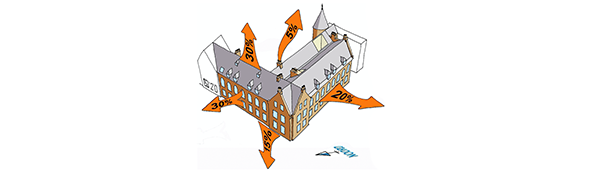 Via het dak verdwijnt circa 30 procent; dat is relatief veel en hangt samen met de wijze van inrichten van de tweede verdieping en de open gebouw-indeling. Via de vensters verdwijnt ook ongeveer 30 procent. De blinde geveldelen zorgen voor naar schatting 20 procent verlies en via de kelderzone zal zo'n 15 procent warmte verloren gaan; dat is meer dan gebruikelijk voor vloerverliezen. Tenslotte zorgen zogenoemde infiltratieverliezen door kierende ramen en deuren, ventilatieopeningen en rookkanalen voor circa vijf procent energieverlies.’