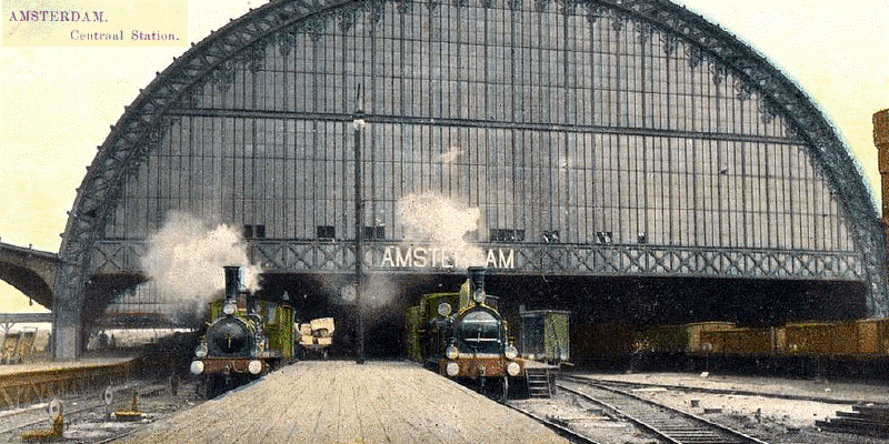 De grote stalen overkapping van het Centraal Station in Amsterdam op een oude ansichtkaart - foto: Wikimedia