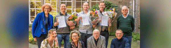De kersverse, gediplomeerde restauratie glazeniers met de docenten en examinatoren - foto: René van den Burg