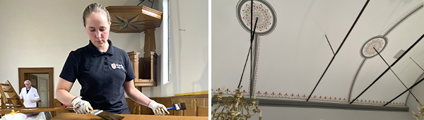 Links: leerling Margo van den Berg, op de achtergrond oud-directeur Gerard de Jongh. Rechts: het plafond is voorzien van nieuwe decoraties – foto's ERM