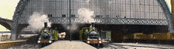 De grote stalen overkapping van het Centraal Station in Amsterdam op een oude ansichtkaart - foto: Wikimedia