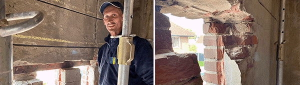 Links: Reinald Aalderink aan het werk in de toren. Rechts: veel afgebrokkelde stenen rond de sponningen van de glas-in-loodramen. – foto's ERM