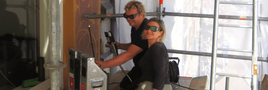 Aga en Eros jr. van De Vink Restauratiewerken tijdens lasertest