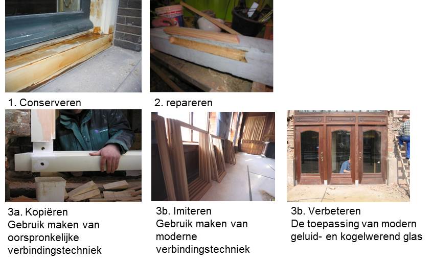 - 3c - Verbeteren: het bestaande beeld blijft zoveel mogelijk intact. Het betreffende onderdeel wordt echter aangepast aan moderne eisen op het gebied van akoestische en thermische isolatie en inbraakwering. Denk bijvoorbeeld aan achterzetbeglazing bij heel oude vensters met bijzondere detaillering. Andersom kan ook: bijvoorbeeld kunststof kozijnen uit een latere periode vervangen door houten kozijnen die beter passen bij het historische karakter.