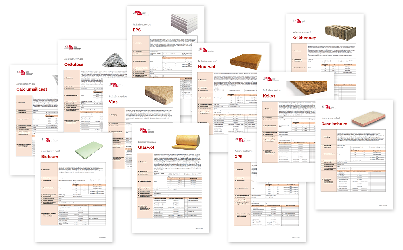 De werkwijze bij het verduurzamen (isoleren) van monumenten staat in de uitvoeringsrichtlijnen van ERM. Maar welke materialen zijn geschikt voor het isoleren van monumenten? Dat is een vraag waar menig architect, adviseur en aannemer regelmatig voor staat bij de voorbereiding van een restauratieproject. In de prestatiebladen staat de meest relevante informatie voor gebruik van het materiaal in monumenten, waaronder de materiaalbeschrijving, materiaalkenmerken en toepassingsgebieden. Ieder prestatieblad bestaat uit een voorblad (met de kenmerken en scores) en een achterblad dat bij ieder prestatieblad identiek is (met de toelichting op de kenmerken en de wijze van scoren).