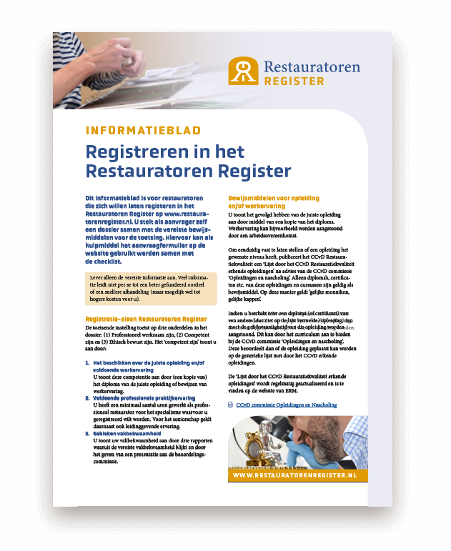 In dit informatieblad kunt u als toekomstig RegisterRestaurator of als gebruiker van het Restauratoren Register meer informatie vinden over het landelijk Restauratoren Register op www.restauratorenregister.nl.