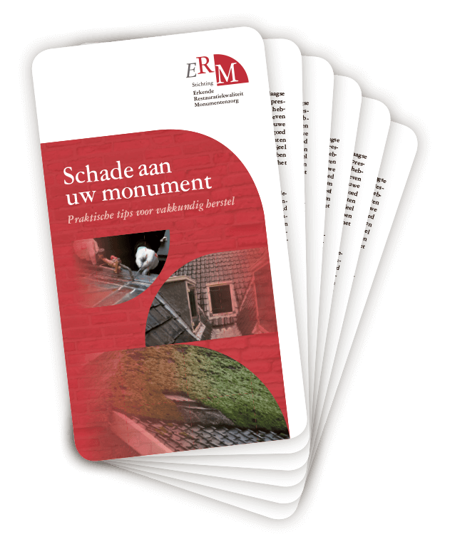 Om eigenaren en beheerders van monumenten te ondersteunen bij het vakkundig laten herstellen van schade aan hun gebouw, heeft de stichting Erkende Restauratiekwaliteit Monumentenzorg de publicatie ‘Praktische tips voor vakkundig herstel’ uitgebracht. De publicatie, in de vorm van een waaier, toont de meest voorkomende schades en beschrijft de mogelijke oorzaken. Vervolgens informeert de waaier over de aanpak, de wijze van herstel en het gebruik van kwaliteitsrichtlijnen daarbij. In veertien bladen wordt ingegaan op de meest voorkomende problemen. Dit zijn onder andere metselwerk met funderingsproblemen, voegwerk met beschadigingen, houtaantasting door schimmels en schilderwerk.